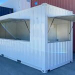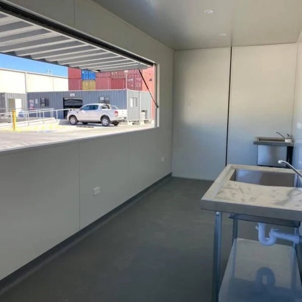 Here is one of our standard kiosk / cafe containers. The container is a new 20’ high cube. The walls have been lined with 50mm cool room panel and the floor is coved and lined with vinyl a vinyl floor.